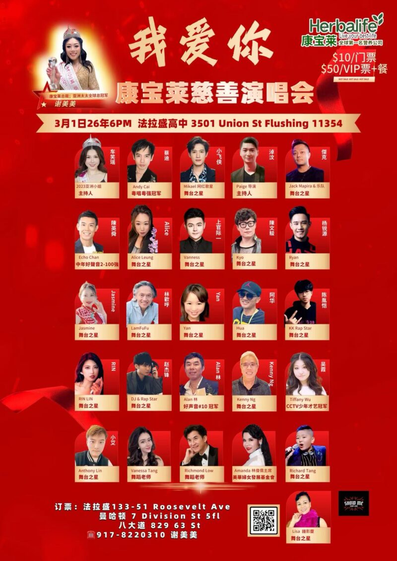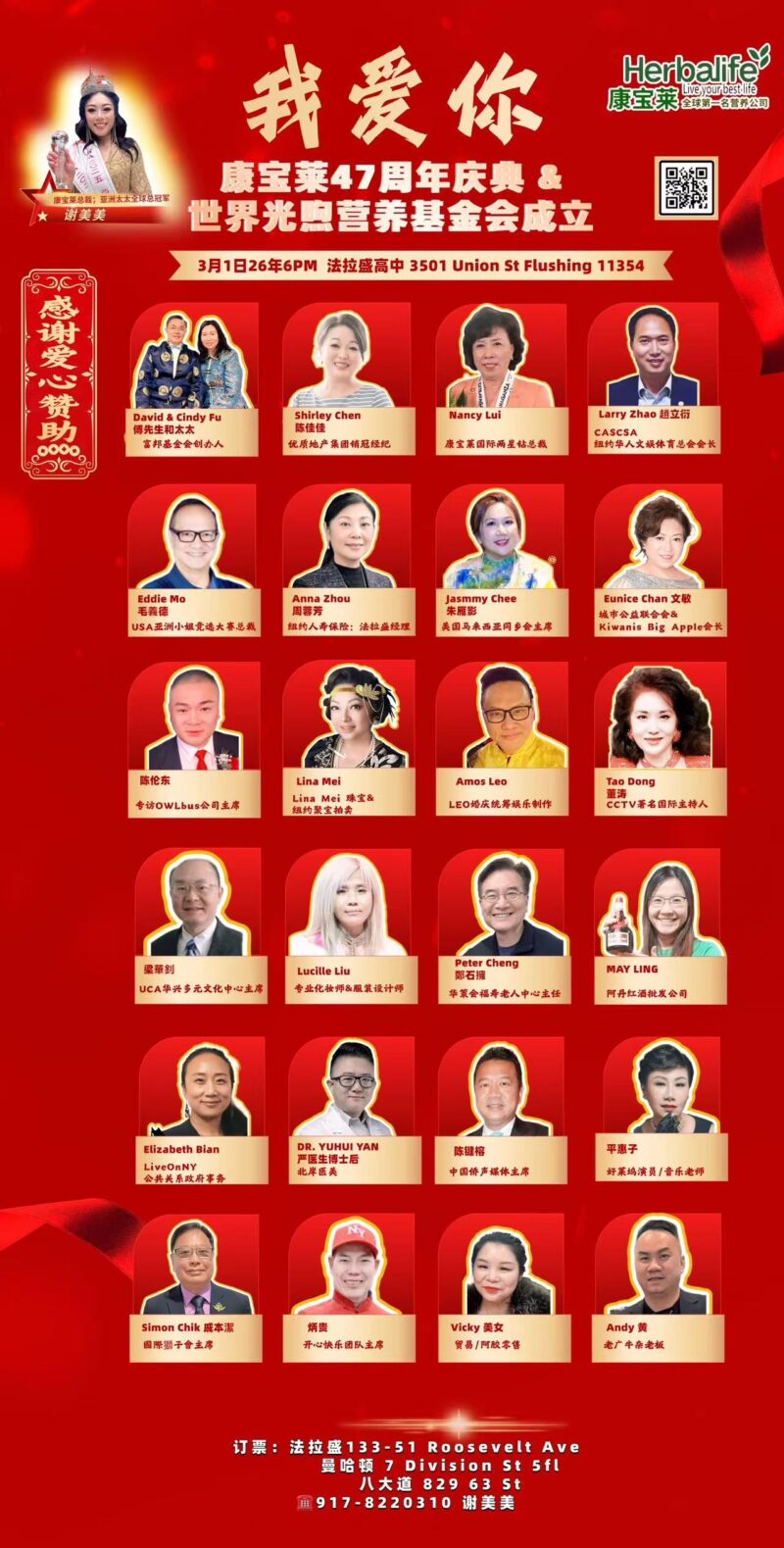 【中国侨声传媒记者林明旭報道】 為慶祝康寶來邁入47周年,一場以「我愛你」為主題的慈善演唱會暨「世界光勳營養基金會」成立與剪綵儀式,即將於今晚6点在法拉盛高中 3501 Union St 盛大舉行。預計將有眾多參眾議員、地方民意代表、社區領袖、同鄉會主席、華人小商家代表,以及藝術界與歌星朋友齊聚一堂,共同見證此一結合健康、慈善與社區發展的歷史時刻。