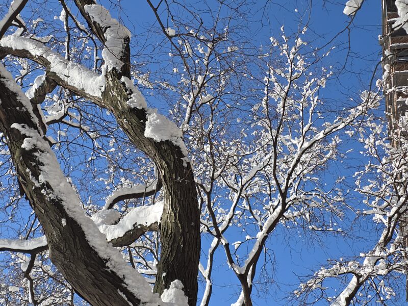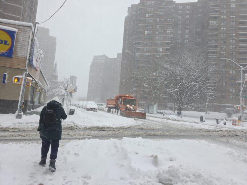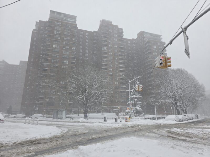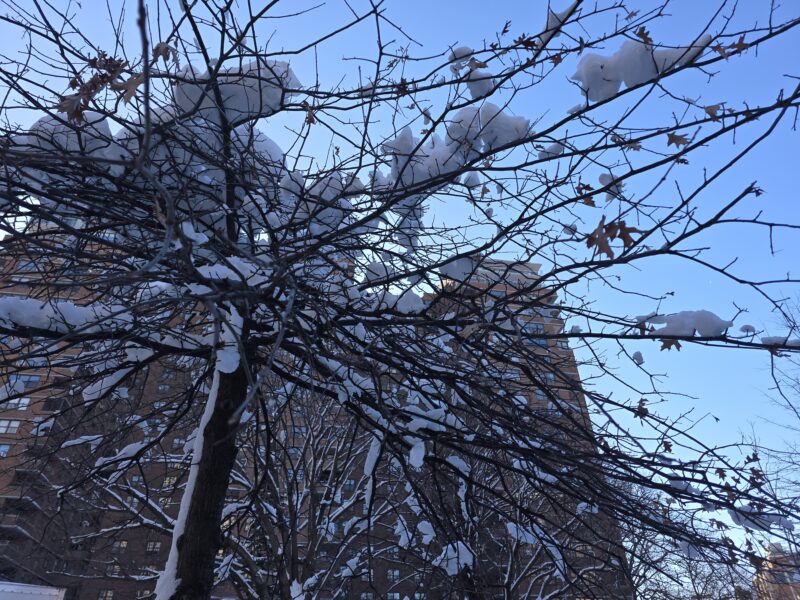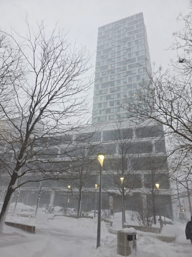 我点开随后的图片。那是风暴的眼睛。不再是书法中提炼过的、留白的雪意,而是 raw的、原始的、铺天盖地的白。一张图中,橙色的铲雪车像一头疲倦的巨兽,在混沌的街景中轰鸣作业,一个裹得严实的身影,背着包,在及膝的雪中蹒跚,渺小如蚁。另一张,自行车被掩埋,只露出扭曲的一角,像雪地中一只冻僵的鸟的翅骨。高楼在纷扬的雪幕后,只剩下深棕的、沉默的剪影,窗格子后的灯火,在下午的天光里,显得孱弱而迷茫。所有的声音都被吸走了,只剩下雪的、无边无际的、柔软的暴力。