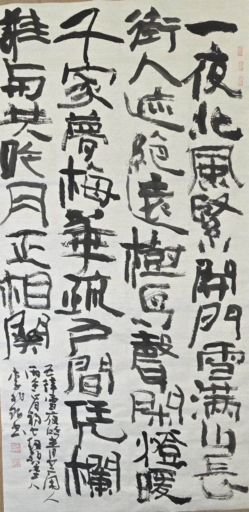 李兆银先生接到了这份沉甸甸的托付。他磨墨,展纸,面对的不仅是诗句,更是窗外那个真实的、咆哮的雪夜,是老友隔空递来的、一颗被风雪淬炼过的心。他的笔落下时,便有了双重的重量:一重是古体诗的格律与意境,那是文化的重;一重是窗外“世纪暴风雪”的压迫与友人心绪的共鸣,那是现实的重。他写的“北风紧”,是真的在拍打窗棂的北风;他写的“雪满山”,是抬眼即见的、吞噬了街道与车辆的雪丘。书法的抽象线条,于此拥有了最具体可感的温度与力度。那飞白,是风撕扯雪沫的痕迹;那浓墨,是夜色与灯晕对抗的疆界;那留白,是天地不仁的、浩瀚的沉默。