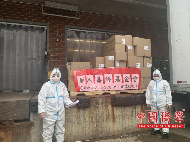 向皇后区长老会医院捐赠医疗物资,右为华人善终基金会董事陈键榕。
