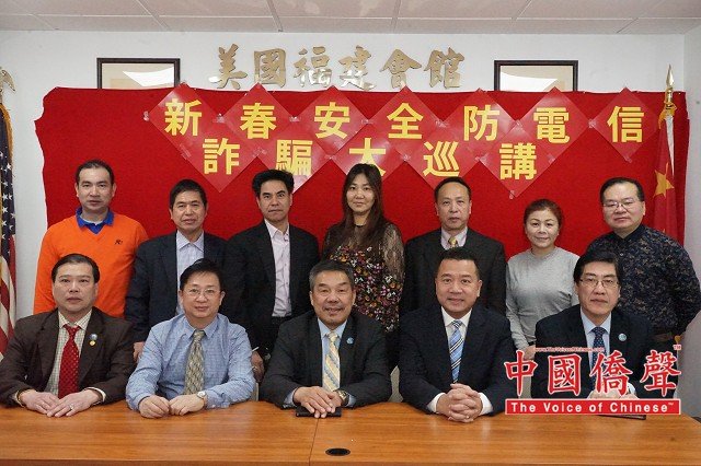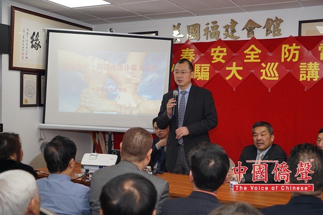 2018中國駐紐約總領館新春防範電信詐騙巡廻第十一場講座(1月25日)下午在華埠的福建會館舉行。邱艦副總領事以及多位領事蒞臨福建會館,為廣大僑胞講解如何防範電信詐騙電話。