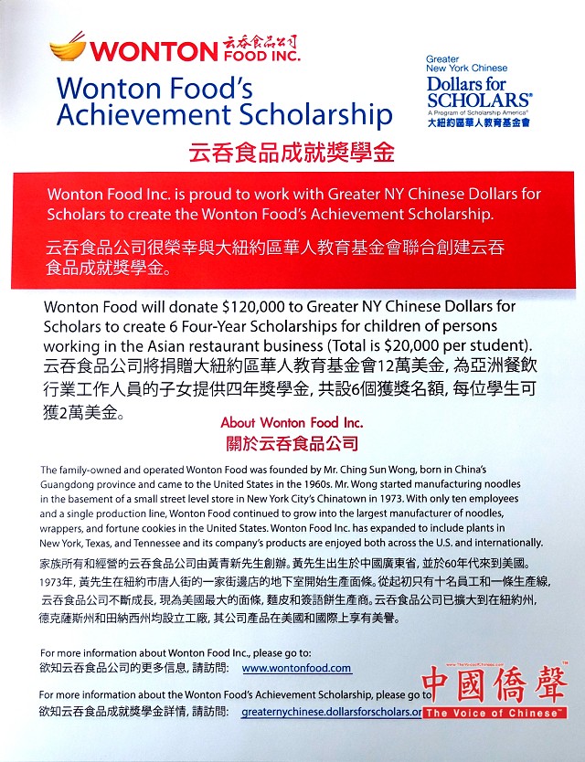 大纽约区华人教育基金会前年获得云吞食品公司捐赠的10万元,成立「云吞食品成就奖学金」,鼓励亚洲餐饮行业从业人员子女完成学业。该基金会会长李德怡在记者会上介绍,该项奖学金向全国开放,没有绿卡或公民等身分限制,所有来自美国各州的12年级华裔餐馆工子女都可以申请,评审团将根据学生对社区的参与和贡献、领导力等条件进行评审。