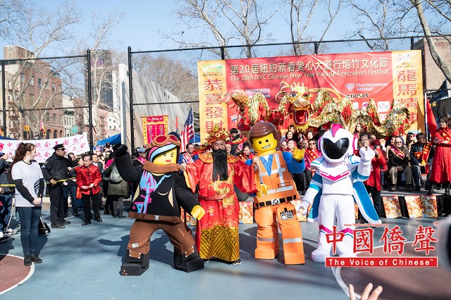 除了燃放鞭炮现场还有醒狮表演、文艺表演、各式摊贩,即将上映的电影「乐高玩电影2」也亲临现场宣传。