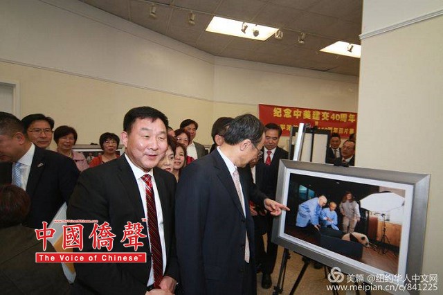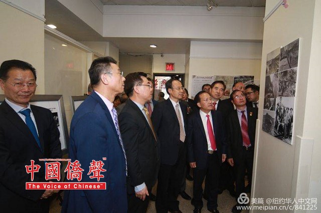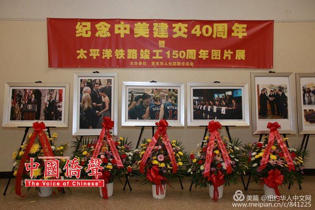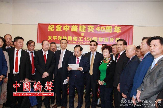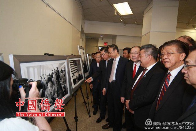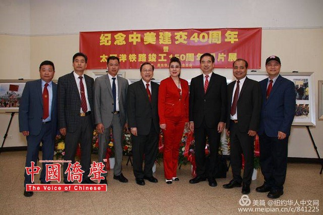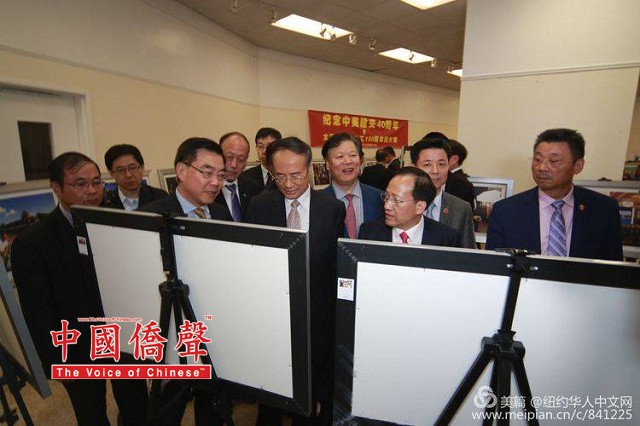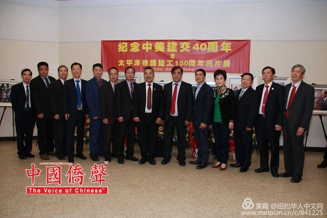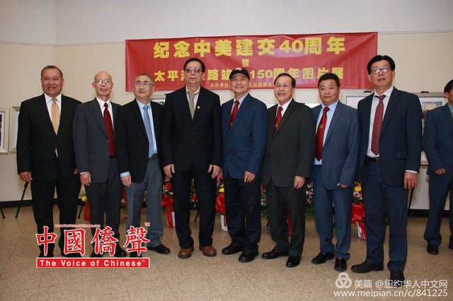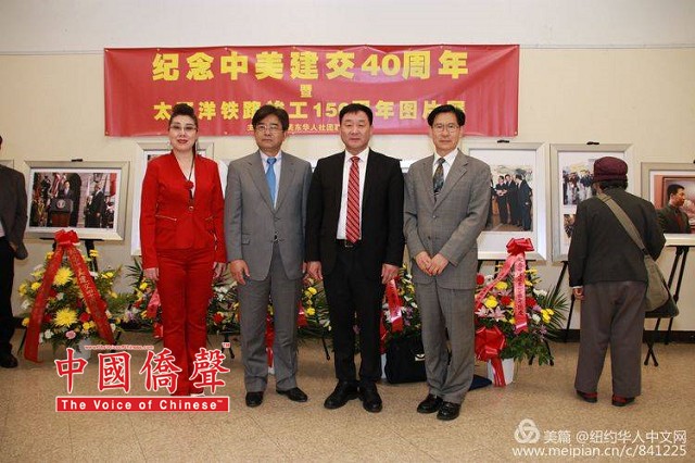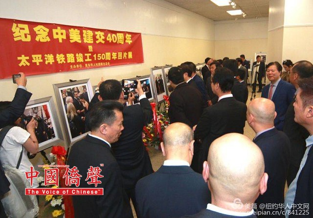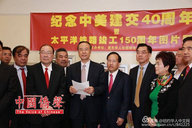 中国侨联主席万立骏与中国驻纽约总领事黄屏在美东华人社团联合总会共同主席梁冠军、陈清泉的陪同下前往在曼哈顿唐人街出席由美东华人社团联合总会举办的《美中建交40周年》暨太平洋铁路竣工150周年图片展剪彩仪式;万立骏表示,展览体现中美两国和平、友好、合作才是最佳选择,也是历史发展的必然趋势,侨联也必将秉承“海内海外并重、新侨老侨并重”的原则,更好的服务好广大华人同胞。