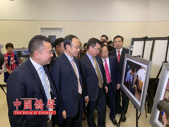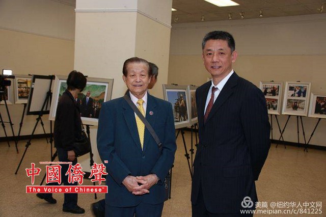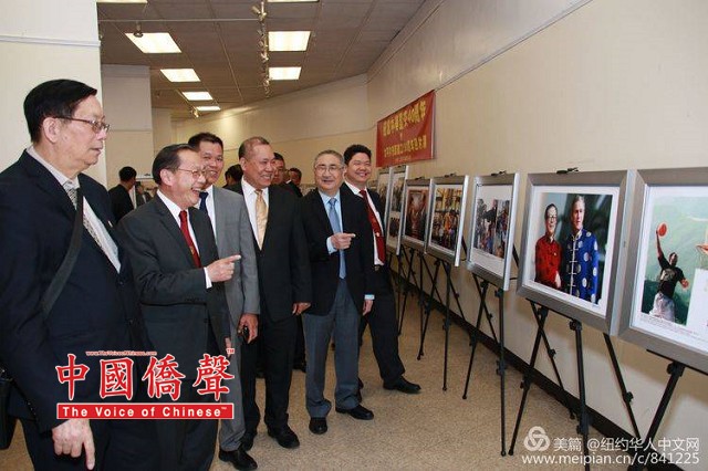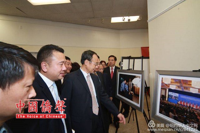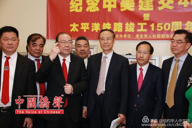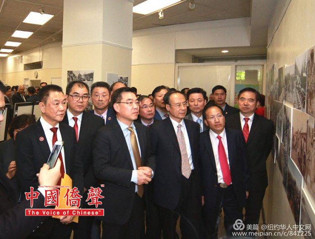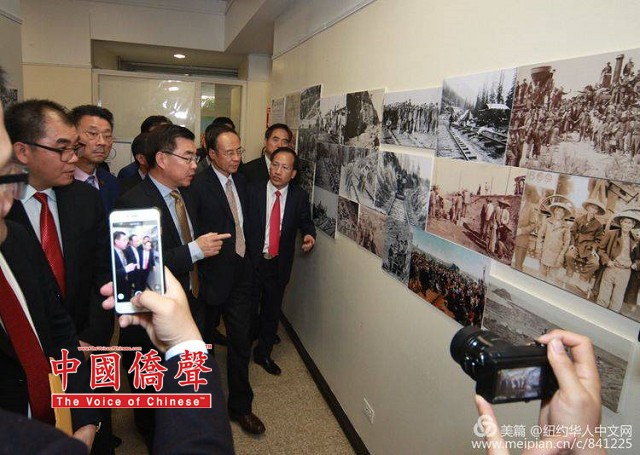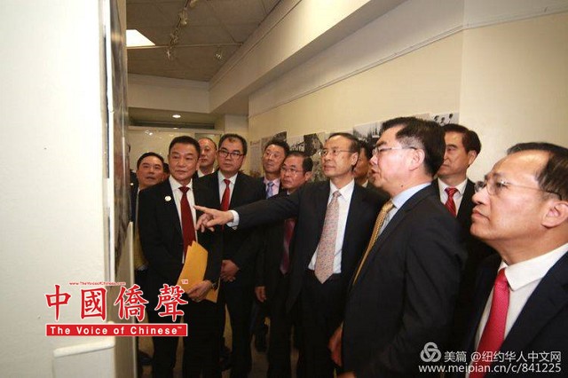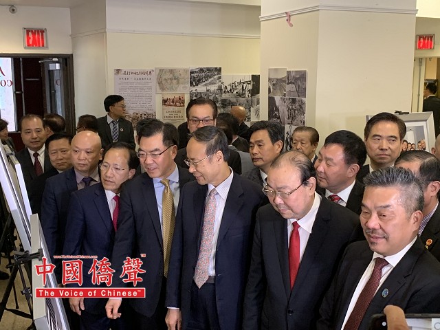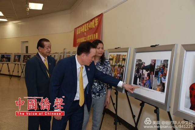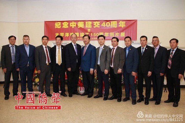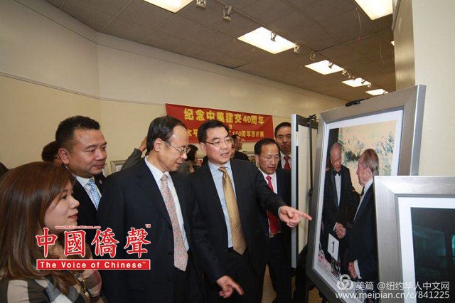 中国侨联主席万立骏与中国驻纽约总领事黄屏在美东华人社团联合总会共同主席梁冠军、陈清泉的陪同下前往在曼哈顿唐人街出席由美东华人社团联合总会举办的《美中建交40周年》暨太平洋铁路竣工150周年图片展剪彩仪式;万立骏表示,展览体现中美两国和平、友好、合作才是最佳选择,也是历史发展的必然趋势,侨联也必将秉承“海内海外并重、新侨老侨并重”的原则,更好的服务好广大华人同胞。
