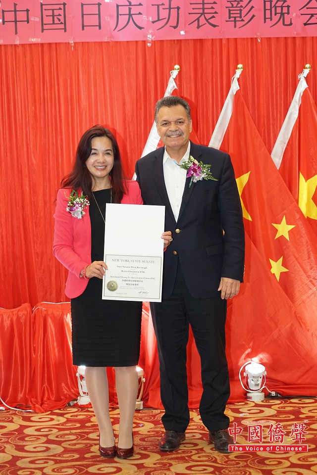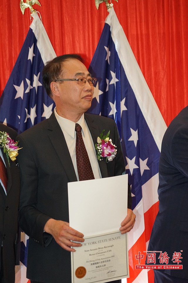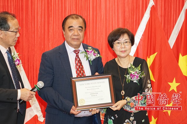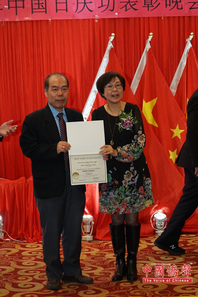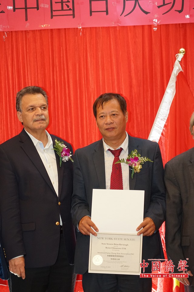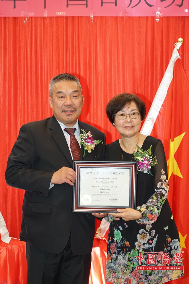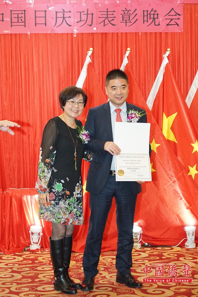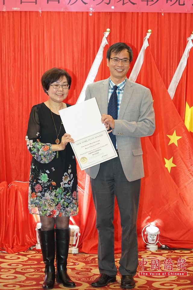 美国福建同乡会負責人陈学端表示举办了六场大型庆祝新中国成立国庆、中建建交四十周年、纽约州参议院通过中国日活动,感谢大家为世界和平、有这么多热心人士共同努力,使活动受到社会的认可,将庆典永载纽约移民史册。回顾四十年中美建交的丰硕成果,让我们体会到合作共赢的作用。今天表彰大会是进一步汇聚大家的力量,激发了文化认同,携手共进,把中华民族文化复兴做的更好。