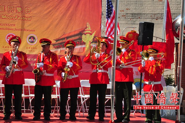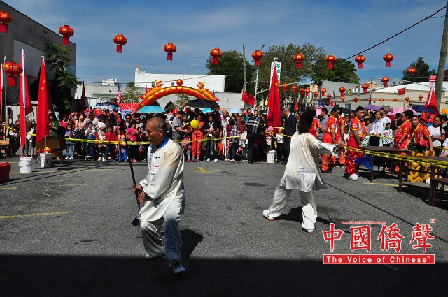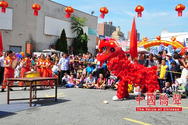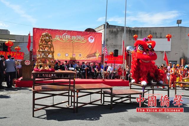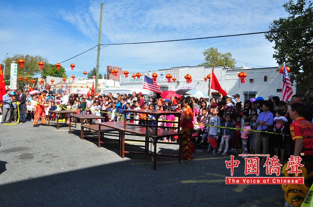 在民选官员纷纷为该活动的主协办方送上褒奖状后,喜庆而热烈的表演轮番登场,有彩龙飞舞、雄狮高空表演、醒狮采青、礼花燃放、庄严的升国旗仪式,以及精彩的文艺表演。随后最令人期待的时刻到来,向民众免费赠送月饼。一时间现场人头攒动,美中两国官员和数十名义工齐动手,将装有广式和福建月饼的火红口袋一一递到民众的手上。