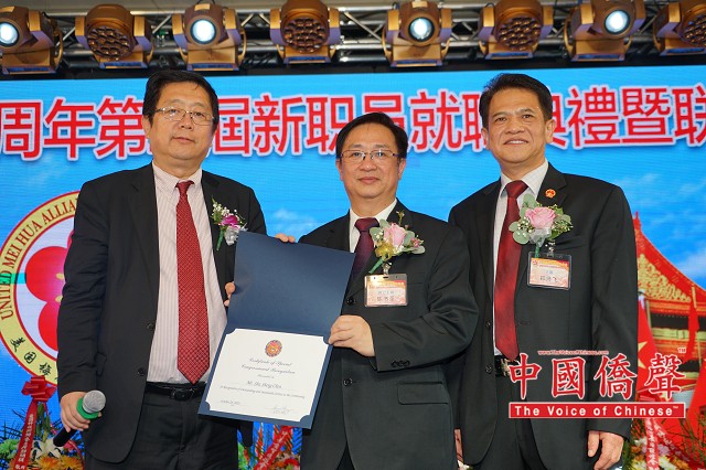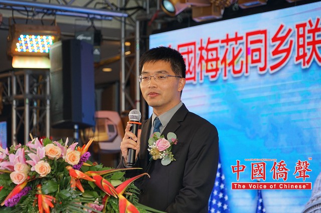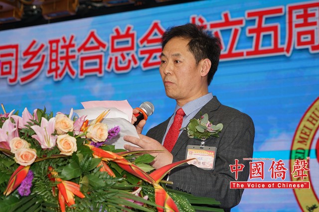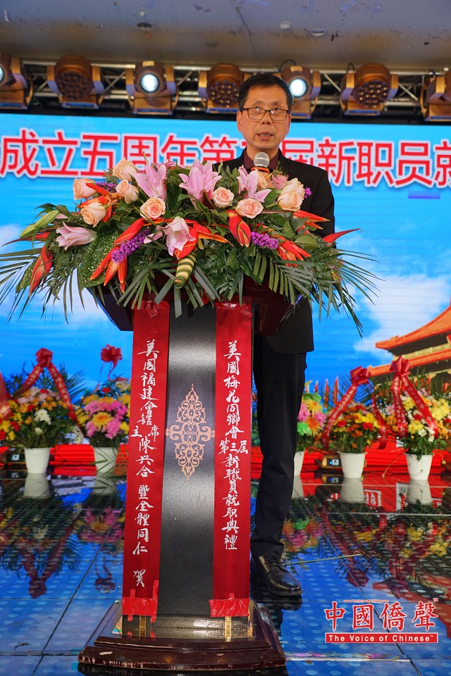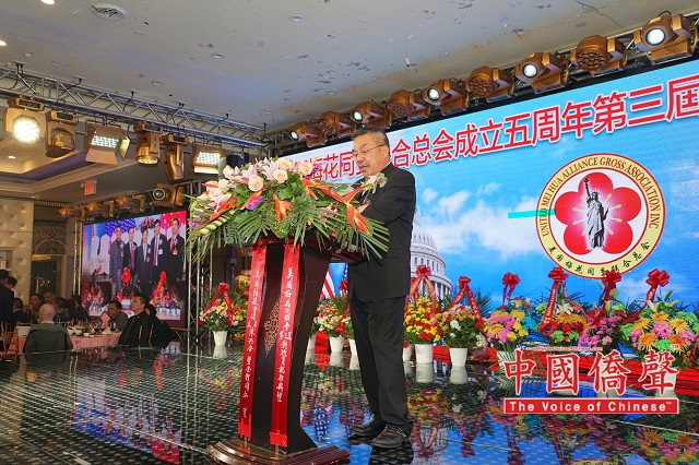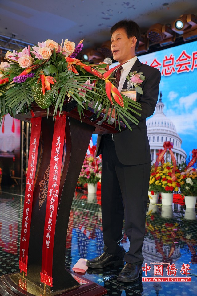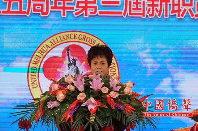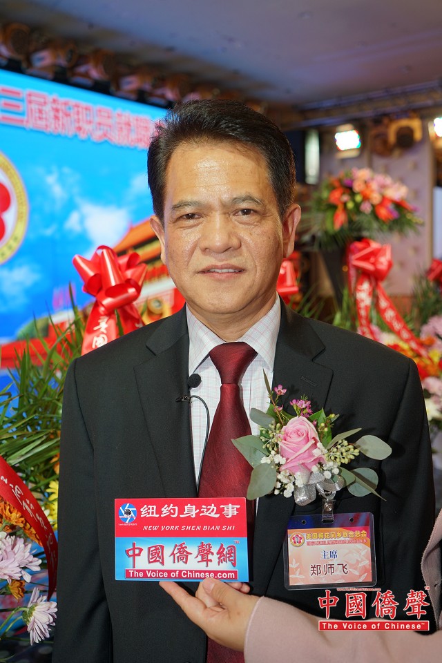 郑师飞表示,今年十月恰逢祖籍国70华诞,中美建交40周年,10月1日又是华裔周,而联合总会也迎来了成立五周年庆典和第三届新职员就职。该会在全美有约5000名会员,服务于各行各业。联合总会自成立以来,响应侨界举办的各类爱国活动,团结兄弟侨团,帮助梅花镇乡亲,例如,帮助旅美打拼多年的耆老落叶归根,号召会员为家乡兴建老人中心捐款等。他感谢总会全体同仁的信任和支持,他将继续秉承总会宗旨加强与兄弟侨团的互动,增加乡亲爱国爱乡的意识,积极为中美双边关系多做贡献。