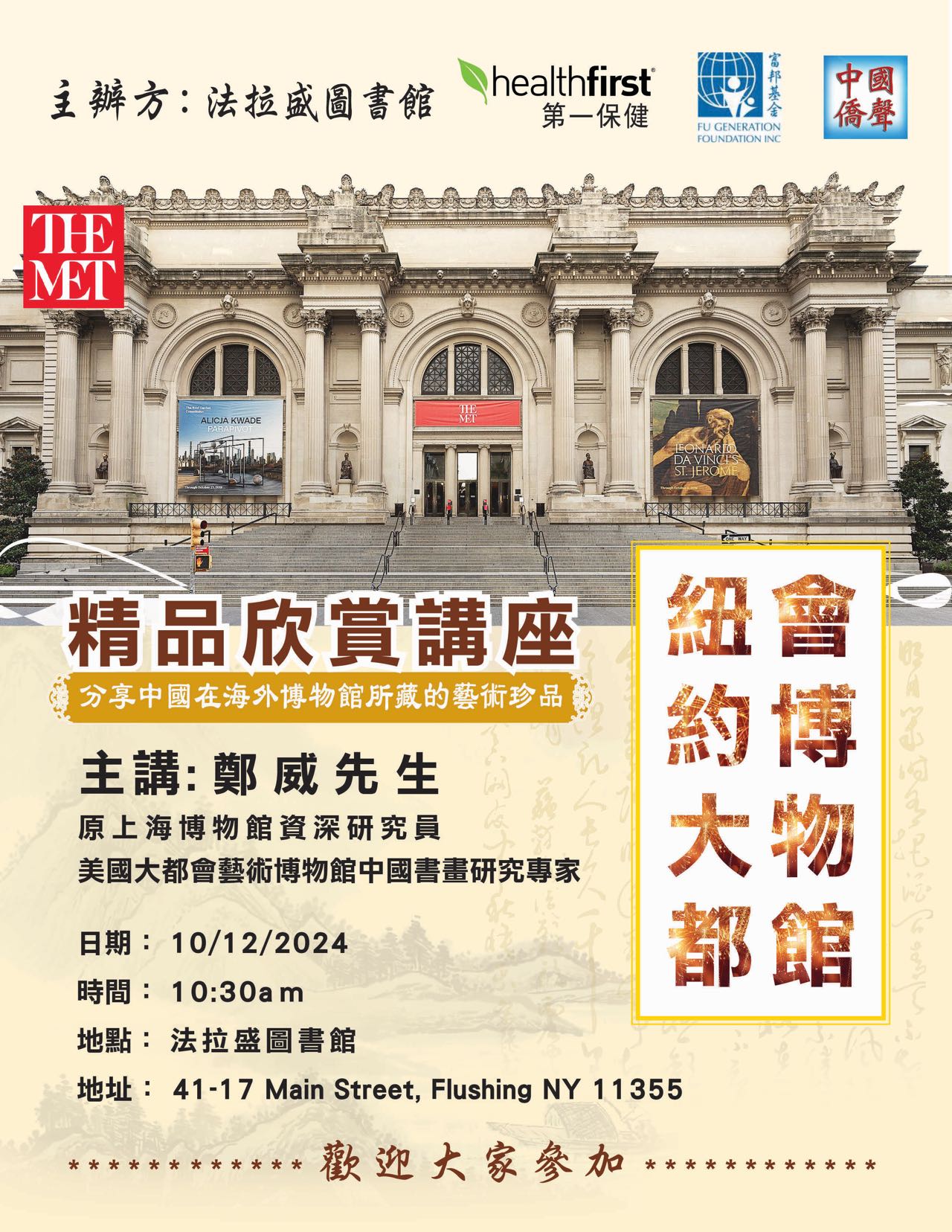 【中国侨声传媒记者张伯良报道】由法拉盛图书馆、第一保健、富邦基金、美中文化传播交流协会、中国侨声文化传媒集团,联合主办的,分享中国在海外博物馆所藏的艺术珍品,精品欣赏讲座,将于10月12日在法拉盛图书馆举行,讲座将由原上海博物馆资深研究员、美国大都会艺术博物馆中国书画研究专家,郑威先生主讲。