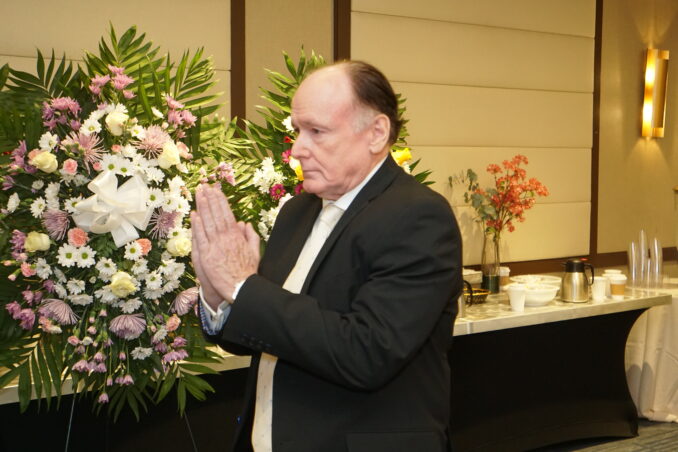 本次追思活动由国际警察与退伍军人基金会及繁荣社区基金会主席陈卫主办。主办方特别邀请 Michael Leung 爵士生前的至亲好友、长期合作伙伴,以及多年来并肩投入公益事业的同仁出席。追悼仪式在庄重严肃的氛围中进行,与会者神情凝重,通过静默致意、深情悼词与肃穆鞠躬,表达对 Michael Leung 爵士的深切哀思与崇高敬意。