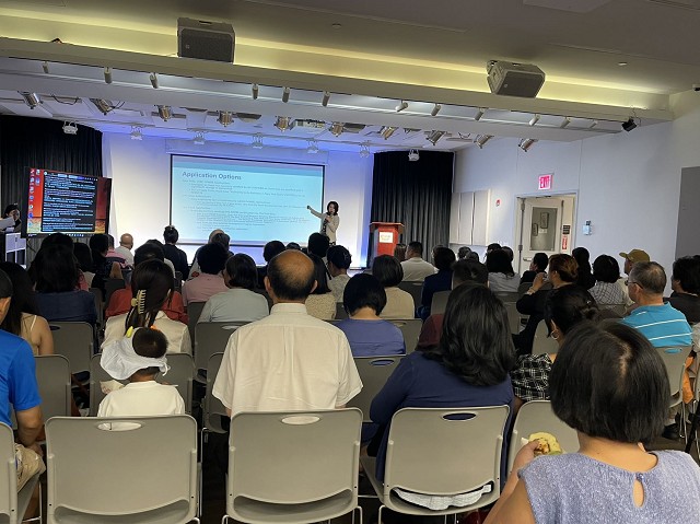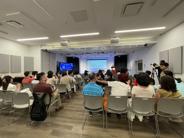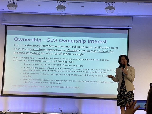 來自帝國發展公司少數族裔與婦女企業發展處的執行顧問**Jenny Low(劉林劍虹 )**向在場60多觀眾介紹如何申請州府的少數族裔和女性企業(MWBE)認證。