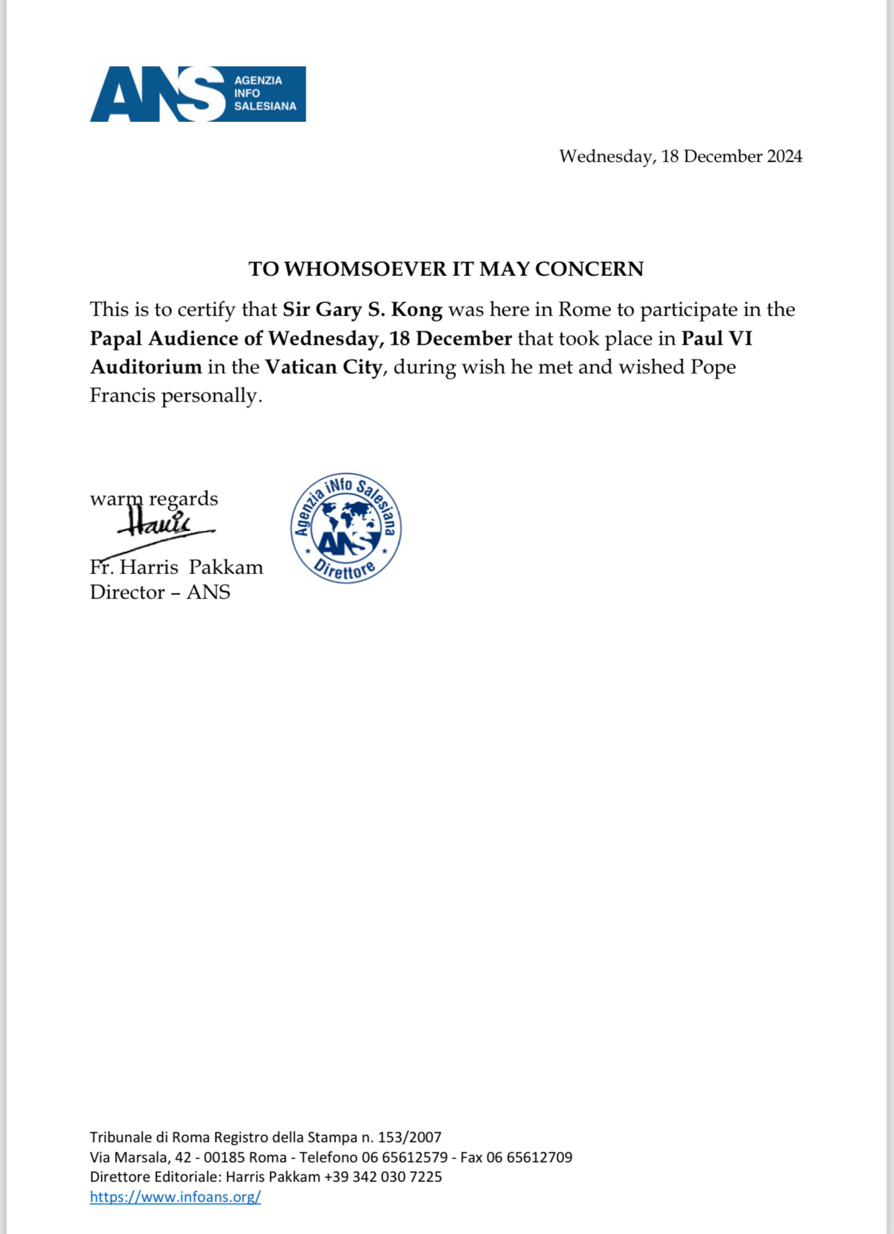 【资料来源:江锦鑫骑士辧公室】12月17日,教宗方济各在梵蒂冈圣座正式接见了中美商会主席江锦鑫骑士(Sir Gary Kong),这位备受推崇的慈善家。此次会晤旨在促进宗教与文化的跨国交流,并讨论慈善事业在现代社会中的角色与影响。