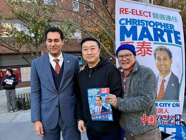 第一選區市議員馬泰(Christopher Marte)六月繼民主黨初選贏得連任提名後,昨天(11/4)大選日打敗共和黨市議員候選人丘海倫,順利獲得第二屆連任。