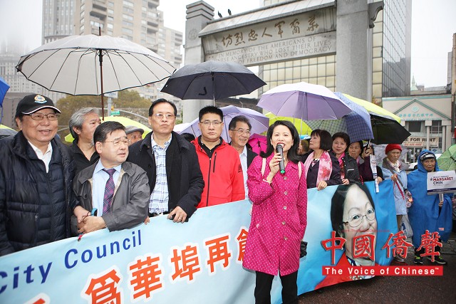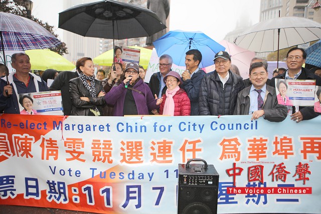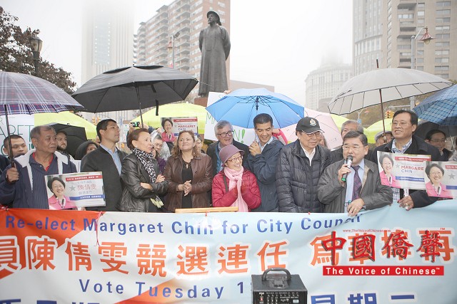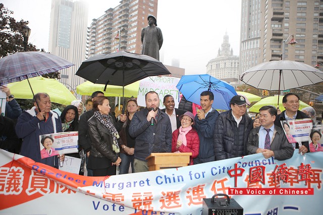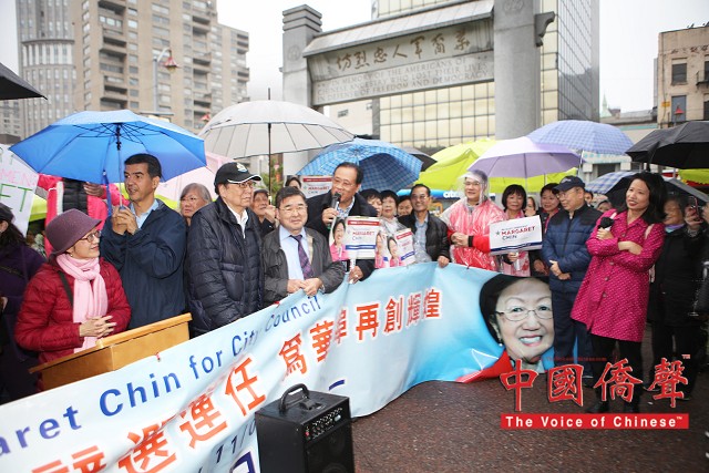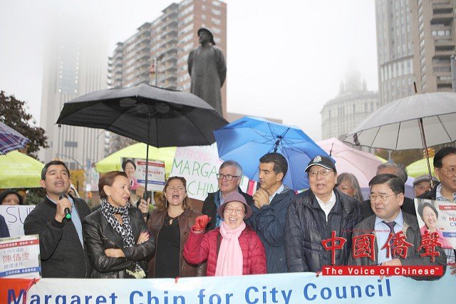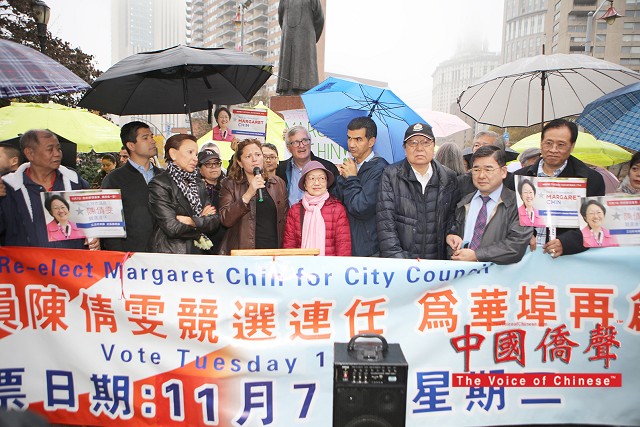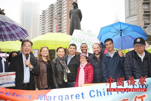 到場為陳倩雯打氣的民選官員包括:國會議員維樂貴絲,州眾議員卡笵納,紐約市議長馬麗桃,市議員顧雅明,萬齊家,孟特斯,Corey Johnson, Richie Torres, 及Ydanis Rodriguez。眾多支持陳倩雯的華人社團及其領導人也到場表示鼎力支持,及發表演說。他們都贊揚陳議員在任八年間為第一市區的居民做出了很多的成績,為社區帶來不少的資源和福利,包括: 教育資源,老人服務經費,可負擔房屋,及托兒服務。在發言人士演講之間,集會現場不時聽到了:”陳倩雯當選!” 及”再多四年!” 的口號。