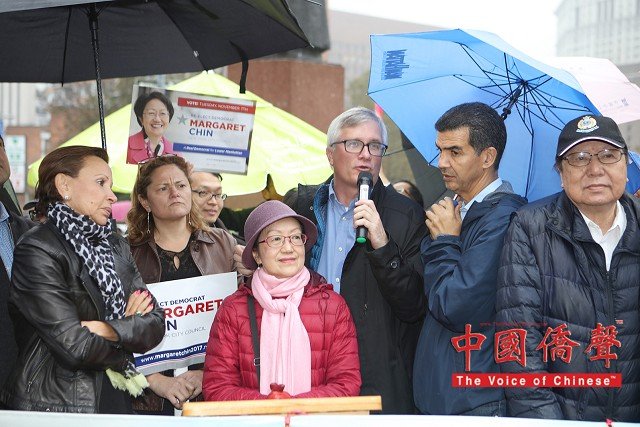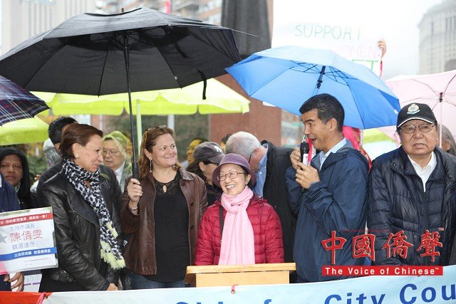 11月5日,超過百多名支持者冒著微雨聚集在且林事果廣場為陳倩雯市議員競選連任造勢,呼籲第一市議區的選民在11月7日,星期二,積極參加選舉,投陳倩雯神聖一票!