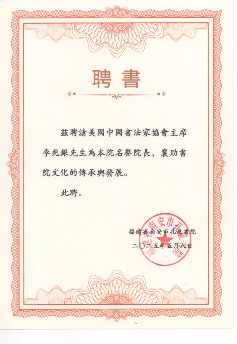 2025年5月8日,福建省南安市孔泉書院聘請美國中國書法家協會會長李兆銀為名譽院長。