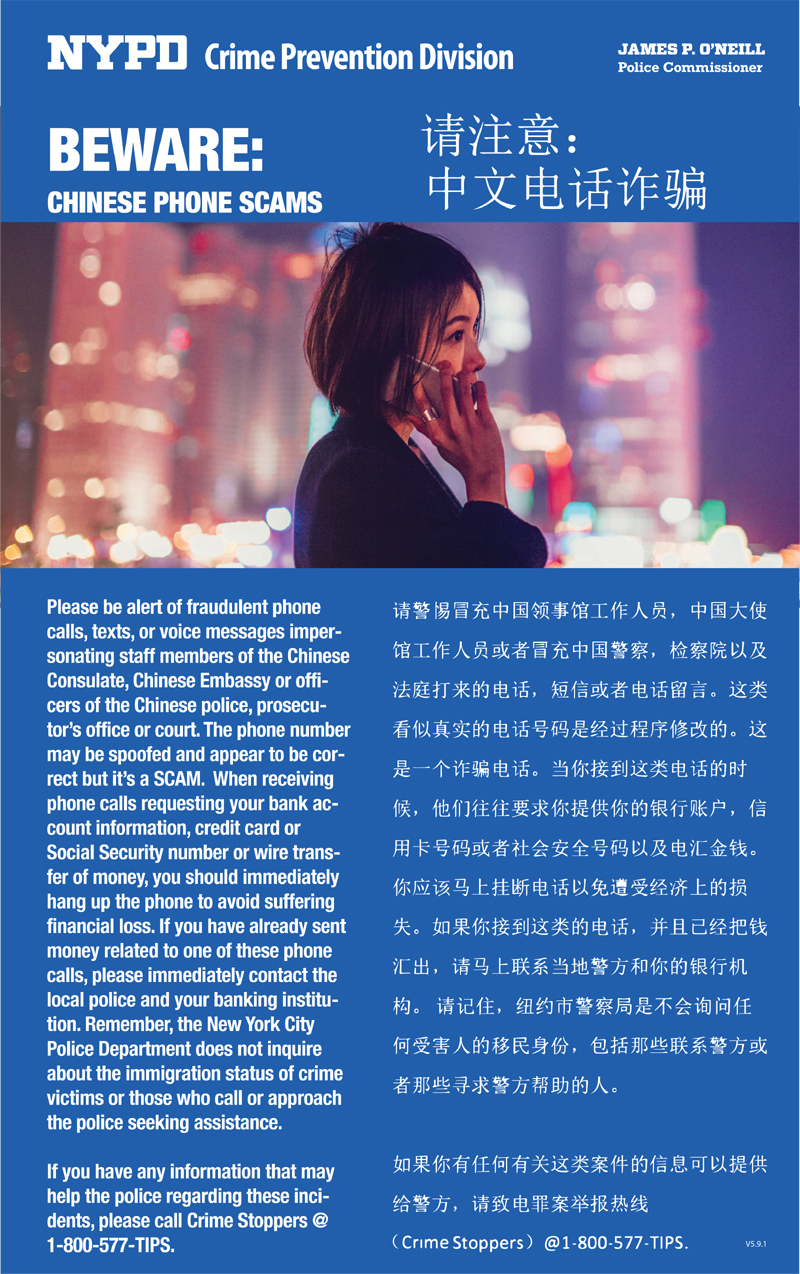 【中國僑聲文化傳媒記者:張伯良紐約報導】紐約市警察局印製海報呼籲市民警惕詐騙電話,內容如下:請警惕冒充中國領事館工作人員,中國大使館工作人員或者冒充中國警察,檢察院以及法庭打來的電話,短信或者電話留言。這類看似真實的電話號碼是經過程序修改的。這是一個詐騙電話。當你接到這類電話的時候,他們往往要求你提供你的銀行賬戶,信用卡號碼或者社會安全號碼以及電匯金錢。你應該馬上掛斷電話以免遭受經濟上的損失。如果你接到這類的電話,並且已經把錢匯出, 請馬上聯繫當地警方和你的銀行機構。請記住,紐約市警察局是不會詢問任何受害人的移民身份,包括那些聯繫警方或者那些尋求警方幫助的人。