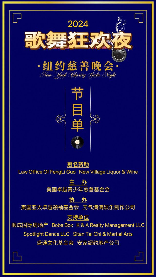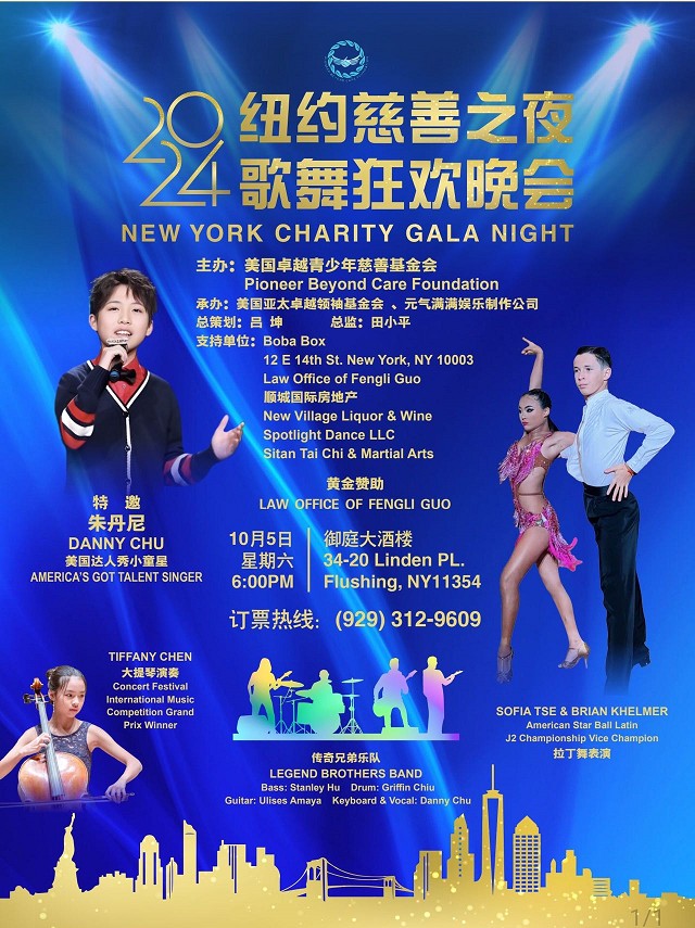 【中侨传媒记者依依报道】10/5/2024 纽约慈善之夜歌舞狂欢晚会下午六点至十点在御庭酒楼举行!由美国卓越青少今慈善基金会主办及由美国亚太卓越领袖基金会、知名歌唱家吕坤老师和元气满满娱乐制作公司承办及策划,希望能培养出优秀的演艺青少年人才,这次特别邀请到美国达人秀小童星朱丹尼作为表演嘉宾之一,现场还有多位歌舞精湛的歌手和嘉宾表演精彩的节目,有兴趣参加的朋友请联系:347-830-0888.