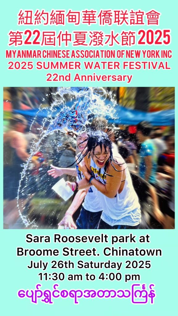 “雁影留声”报道 一年一度最受欢迎的仲夏泼水节强势回归,由纽约缅甸华侨联谊会主办的第22届仲夏泼水节,将在7月26号,时间11:30到下午4:00在唐人街罗斯福公园举行。缅甸华侨联谊会主席苏焕光表示泼水节是缅甸最盛大的传统节日之一,被视为缅甸的新年及旨在强化社区联系方式和展示文化遗产,泼水代表洗去过去一年不顺与烦恼,迎来全新的开始,人们相信水能净化身心带来好运和祝福,因此在节日期间,大家互相泼水象征祝福与洁净,除了互相泼水,唱歌跳舞,届时将会有来自各地的民选官员、社区侨领及居民朋友们共聚一堂。现场还有各种东南亚的美食摊位,免费入场,欢迎大家一起共襄盛举!(活动地址:Sara Roosevelt Park at Broome street, China Town, 7/26 Saturday 11.30am-4pm )