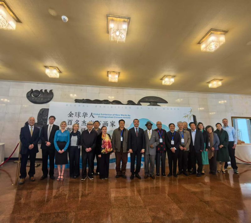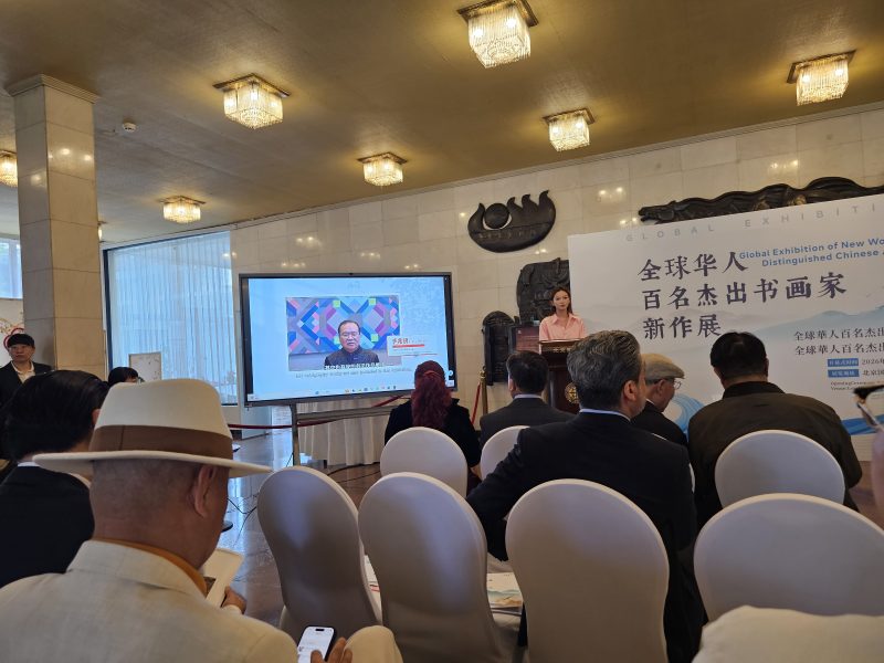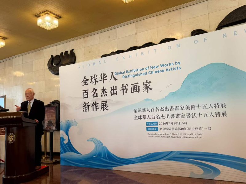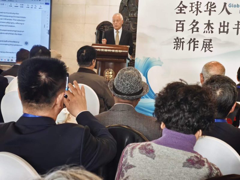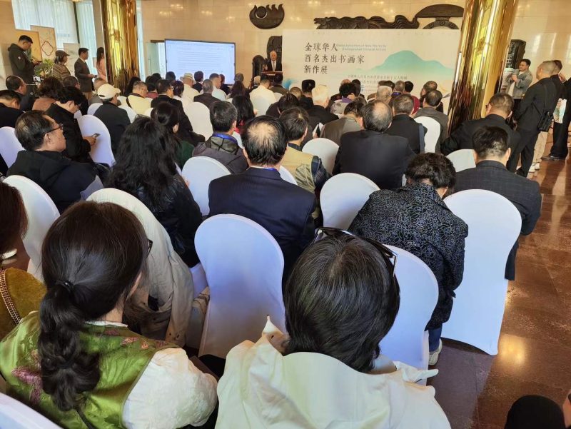 [中国侨声传媒纽约报道]4月10日,全球华人百名杰出书画家新作展在北京国际部俱乐部展厅举行。曾经接待过许多国际政要和知名人士的北京国际俱乐部宽敞的大厅内,竖立着全球华人百名杰出书画家新作展的大背景版。大屏幕上播放着专为此次展览制作的电视片《墨润五洲一全球华人百名杰出书画家新作展》。