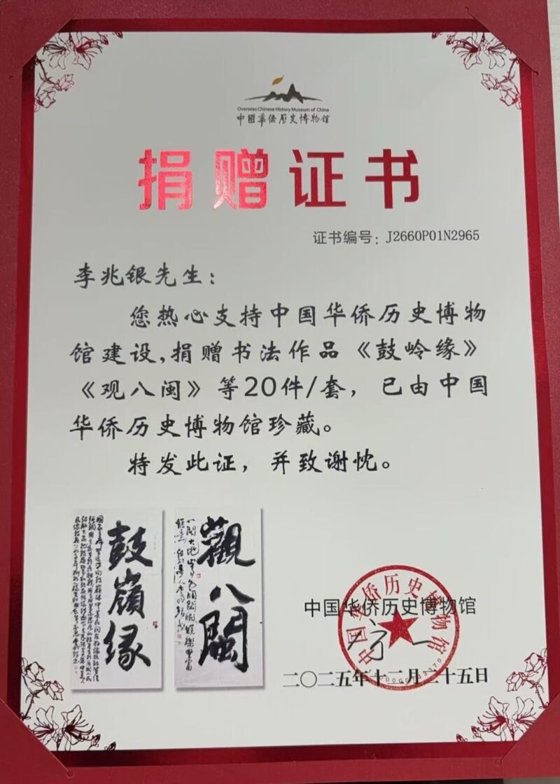 【中国侨声传媒报道】2025年12月25日,美国中国书法家协会会长李兆银向中国华侨历史博物馆捐赠“二十幅书法作品”。