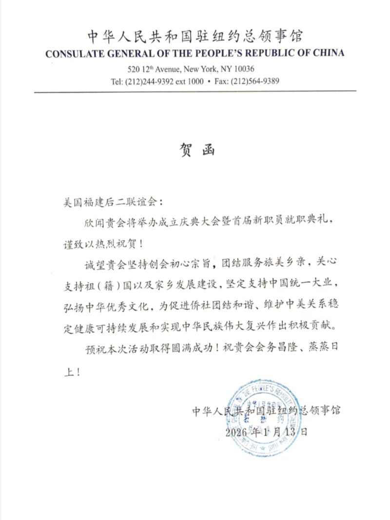 • 中国驻纽约总领馆,石家庄市侨联,芜湖市侨联,定西市侨联,庆阳市侨联,德阳市侨联,厦门市思明区侨联,福建省连江县侨办,福建省连江县侨联,琯头镇人民政府,琯头镇侨联,美国福建联合总会驻闽办事处,后二村委会,后二村老人会等发来贺函。