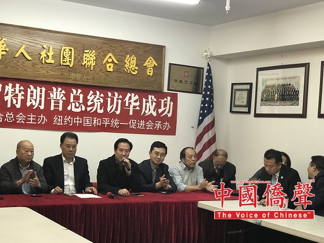 由美東華人社團聯合總會主辦,紐約中國和平統一促進會承辦的熱烈祝賀特朗普總統訪華成功座談會11月11日下午在華埠舉行,座談會由項靜文主持,她說,首先歡迎大家出席今天的座談會,應中國國家主席習近平邀請,11月8日至10日,美國總統特朗普對中國進行國事訪問已經圓滿結束,會晤取得重要、豐碩成果,希望大家暢所欲言發表對這次特朗普訪華的感想。