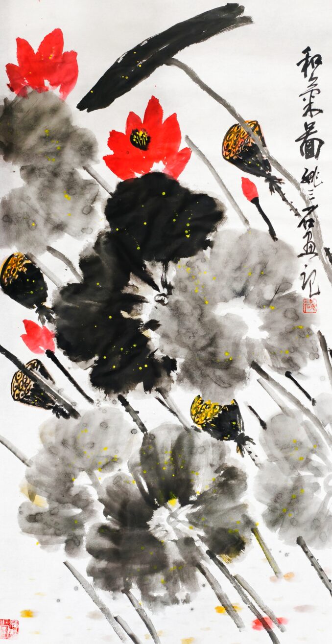 初识姚三石的艺术,便被他“诗书画三绝”的造诣所折服。他的旧体诗最见功底,没有华丽辞藻的堆砌,却字字质朴、句句含情。耗时多年写就的《诗评书画百家》,百首诗作点评古今名家,既有对书画技法的精准剖析,又有对艺术精神的深刻体悟,读来如与一位资深艺评家促膝长谈,字里行间皆是对艺术的赤诚。书法是他的“心头好”,初学颜真卿打下雄浑筋骨,后又潜心钻研“二王”的飘逸、张旭与怀素的狂放,最终熔铸出独树一帜的行草风格。他的笔墨娴熟老辣,落笔时似有疾风过境,线条飞动洒脱却又不失法度,一撇一捺里藏着鲁南汉子的豪迈与细腻。而最具代表性的,当属他的荷花画作。姚氏秋荷代表作《荷风送香》等作品里,墨色在宣纸上淋漓晕染,荷叶的苍劲、荷花的清雅跃然纸上,既保有传统水墨的意境悠远,又暗含现代审美的简约灵动,被国际友人赞为“东方美学名片”,绝非虚言。