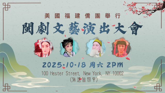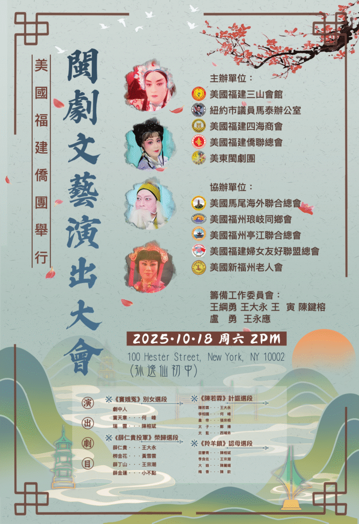 【中國僑聲記者林明旭紐報導】為弘揚閩劇藝術、傳承中華優秀傳統文化,美國福建三山會館、紐約市議員馬泰辦公室、美國福建四海商會、美國福建僑聯總會及美東閩劇團將於2025年10月18日(星期六)下午2時,在紐約孫逸仙中學(100 Hester Street, New York, NY 10002)聯合舉辦「閩劇文藝演出大會」。