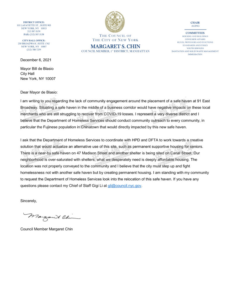 我代表的是一个非常多元化的地区,我相信无家可归者服务部应该对每个社区进行社区外展,尤其是唐人街的福建人社区,将会直接受到这个游民所的影响。我要求无家可归者服务部与 HPD 和 DFTA 协调,以实现创造性的可以替代用途的解决方案,例如为老年人提供永久性住房,或可负担房屋。