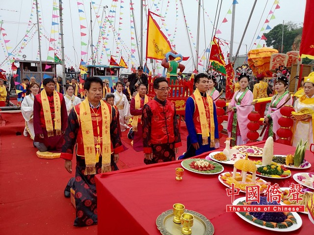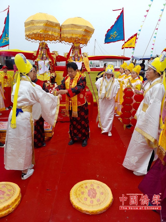 连江县妈祖文化研究会应邀出席这次活动,杨文健会长带领副会长郑德佺、唐宗斌、副秘书长郑成乐等摄制人员8 人参与上午8点20分,“海上春祭“大典仪式,并全场摄制活动实况。主祭郑寿本陪祭杨文健率全体信众二百余人,向妈祖金身行三跪九叩之礼,逐次完成迎神上香、行三献之礼、诵读祝文等传统祭祀礼仪。