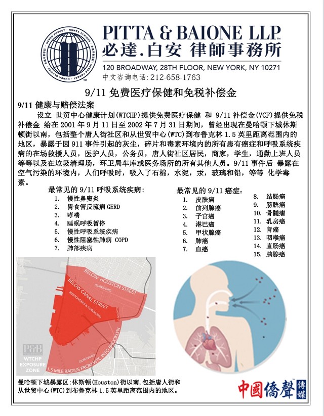2001年9月11日袭击世贸中心、五角大楼和宾夕法尼亚州坠机现场的事件引发有毒空气污染扩散,曼哈顿下城被雾霾覆盖,整个唐人街的民众都呼吸了有毒的空气,导致在灾区内生活的群众患上癌症和其他疾病,然而世界贸易中心 (WTC) 健康计划和 9 月 11 日受害者赔偿基金(VCF)能给予幸存者一点点帮助。申请获批9/11受害者补偿基金需要律师更有条理整理申请人的文书工作,该补偿基金要求登记注册后才能在申请流程开始时交出能够获取批准所需的所有必要文件。专门从事9/11疾病索赔的律师 必达.白安 律师事务所 帮助在2001年9月11日至2002年5月30日期间暴露在9/11毒素环境里的民众免费登记注册,以保障所有幸存者可能需要提交申请补偿金的权利。而已确认患有相关9/11疾病的幸存者可以通过律师提交申请获得免税的经济补偿,已经离世的幸存者的亲人也可能可以获得相应的遗产补偿金。必达.白安 律所全面为符合资格的民众准备必要的文件以支持政府部门能够提高效率帮助所有申请人,特别是可能担心语言不通和其他政府福利的华人社区民众。该律所来自华人社区,有专门从事长者福利的华人9/11律师可以直接与申请人沟通并解答相关问题。