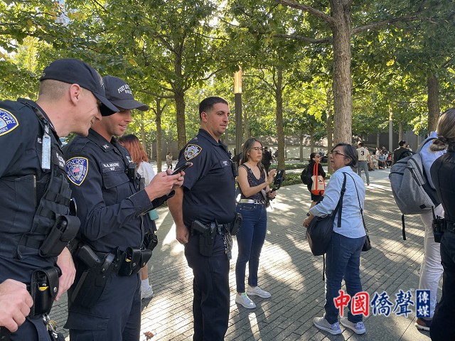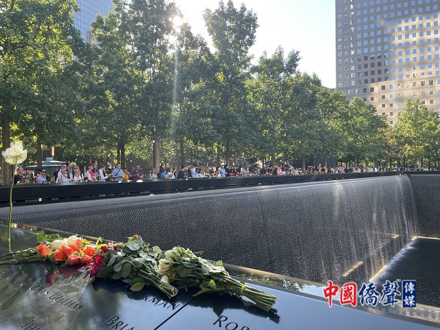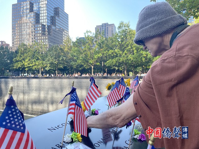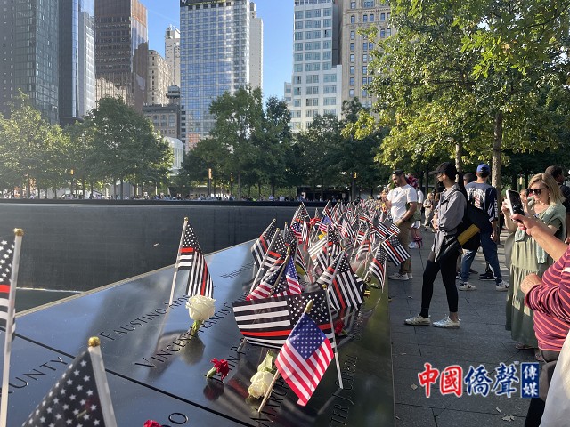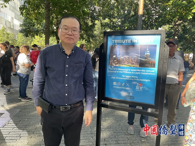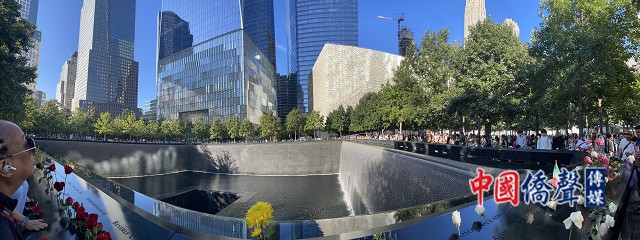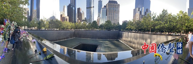 【中国侨声文化传媒记者李兆银报道】今年9月11日的早晨天清气爽,与2001年9月11日的天气相似。23年前的那一天,被劫持的两架客机撞向纽约世贸中心双子塔,23年后,遇难者亲属聚集在世贸中心遗址纪念园。一年一度的傳統911紀念之光將以兩束藍色照亮曼哈頓的天際線,從黃昏到黎明,紐約市60哩半徑範圍內都可以看到。