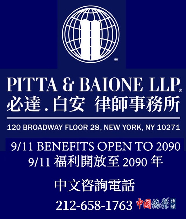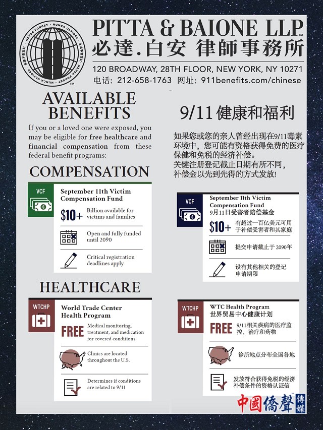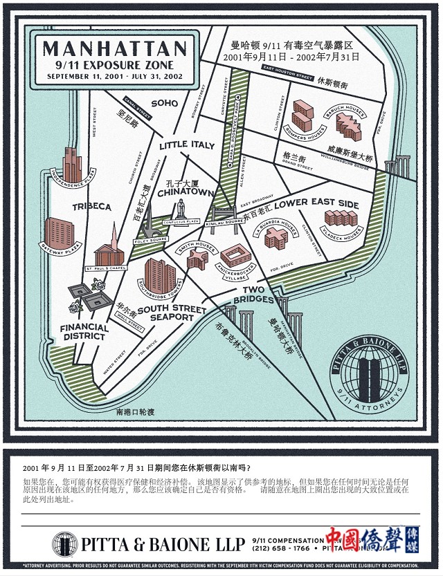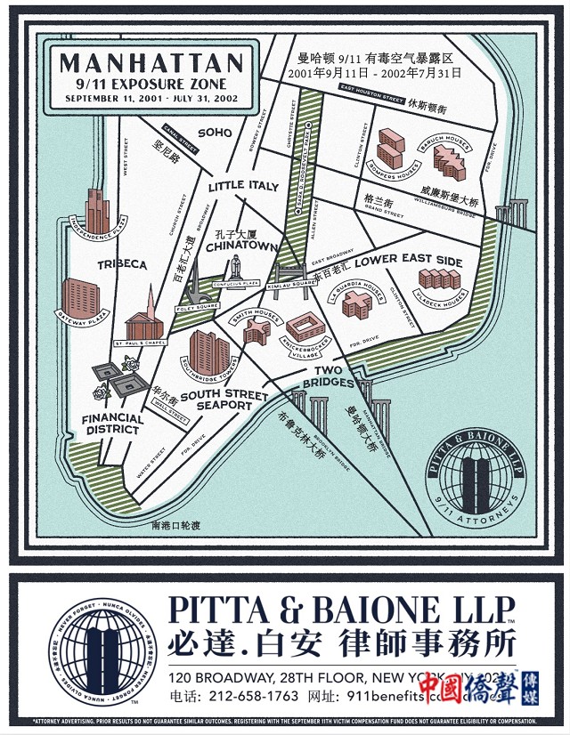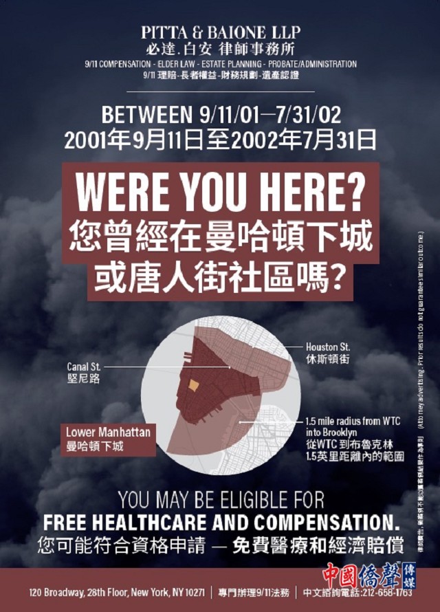 2001年9月11日袭击世贸中心、五角大楼和宾夕法尼亚州坠机现场的事件引发有毒空气污染扩散,曼哈顿下城被雾霾覆盖,整个唐人街的民众都呼吸了有毒的空气,导致在灾区内生活的群众患上癌症和其他疾病,然而世界贸易中心 (WTC) 健康计划和 9 月 11 日受害者赔偿基金(VCF)能给予幸存者一点点帮助。申请获批9/11受害者补偿基金需要律师更有条理整理申请人的文书工作,该补偿基金要求登记注册后才能在申请流程开始时交出能够获取批准所需的所有必要文件。专门从事9/11疾病索赔的律师 必达.白安 律师事务所 帮助在2001年9月11日至2002年5月30日期间暴露在9/11毒素环境里的民众免费登记注册,以保障所有幸存者可能需要提交申请补偿金的权利。而已确认患有相关9/11疾病的幸存者可以通过律师提交申请获得免税的经济补偿,已经离世的幸存者的亲人也可能可以获得相应的遗产补偿金。必达.白安 律所全面为符合资格的民众准备必要的文件以支持政府部门能够提高效率帮助所有申请人,特别是可能担心语言不通和其他政府福利的华人社区民众。该律所来自华人社区,有专门从事长者福利的华人9/11律师可以直接与申请人沟通并解答相关问题。